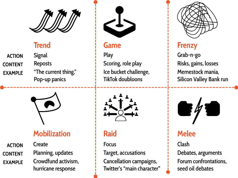 Other kinds of swarm experiences include trends, games, raids, and melees. Trends involve widespread signaling, as seen with trending hashtags or “the current thing.”26 Games are characterized by playful interactions, like sharing contrasting photos to show fitness progress. Raids are adversarial; they involve focusing on a target such as a distressed celebrity. Melees consist of large-scale clashes on topics like health and diet, often taking place in public forums.