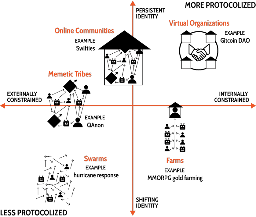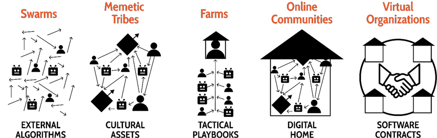 Swarms do not exist in isolation; instead they are part of a rich ecosystem of online formations. Through research, I identified four other archetypes of online formations: memetic tribes, communities, farms, and virtual organizations. Each archetype differs from swarms based on how they encode their own social protocols.