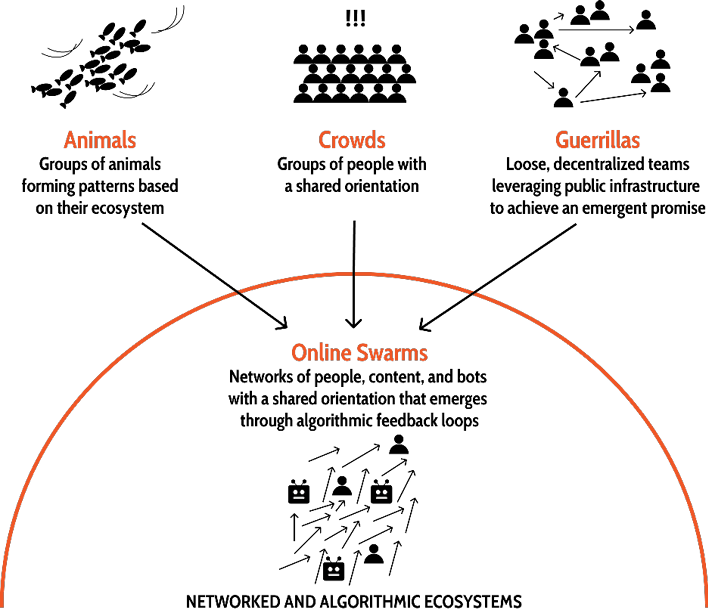 Figure 1. Online swarms exist within networked and algorithmic ecosystems. Swarms are similar but distinct to other collective groups that rely on emergence: animal aggregations, crowds, and guerrillas.