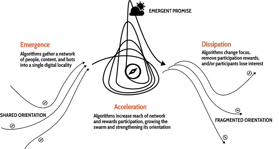 Figure 3. Online swarm lifecycle. Three main phases: emergence, acceleration, and dissipation. During each phase, the online swarm is powered by the web of algorithms in its ecosystem.