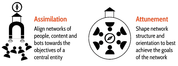 The hurricane response and the bank run are examples of online swarms: networks of people, content, and bots. They allow participants to act individually, with collective impact. Through a shared orientation10 that emerges in algorithmic feedback loops, swarms coordinate without internally directed protocols.11