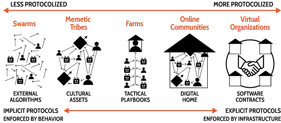 Figure 6. Online formation archetypes can be roughly sorted based on their reliance on implicit and explicit social protocols. Swarms are minimally protocolized; they are reliant on implicit social protocols. In contrast, virtual organizations can have social protocols encoded into software.