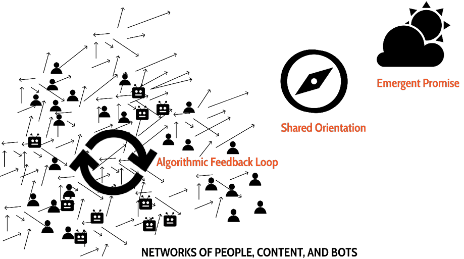 But while swarms have some guerilla-like traits, they are not exactly like guerrilla groups. Jorge and Pablo were part of a much larger network of social media posts and relied on algorithmic feedback loops for coordination. Their swarm would have dissipated if attention had waned or Facebook had removed their ability to communicate. The swarm’s network of people, content, and bots was oriented20 towards the promise; but that does not mean they had the same orientation, only a sufficient overlap. After all, yearning for the sea is a personal calling, interpreted by each of us differently. In summary, swarms are networks of people, content, and bots with shared orientations that are strengthened by their ecosystems’ algorithmic feedback loops.